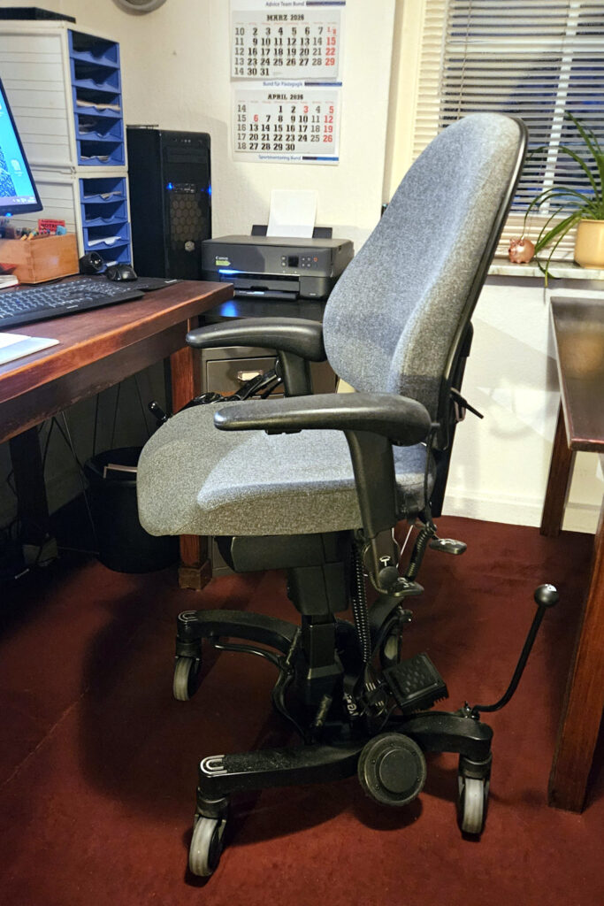 Aufstehen von normaler Sitzhöhe nur mit Hilfe und unter Anstrengung, eigenständig nicht mehr möglich. Erhöhte Sitzflächen notwendig, alternativ ggf. Bankmöbel, Aufstehen dann mühseliges ‘hochhangeln‘. Normalhohe WC’s nicht mehr nutzbar (nur noch mit erhöhenden Sitzauflagen oder ohne Hose stehend). Duschen frei stehend sehr anstrengend/schwierig. Umdrehen und Aufrichten im Bett nur noch mit allergrößter Anstrengung möglich.
